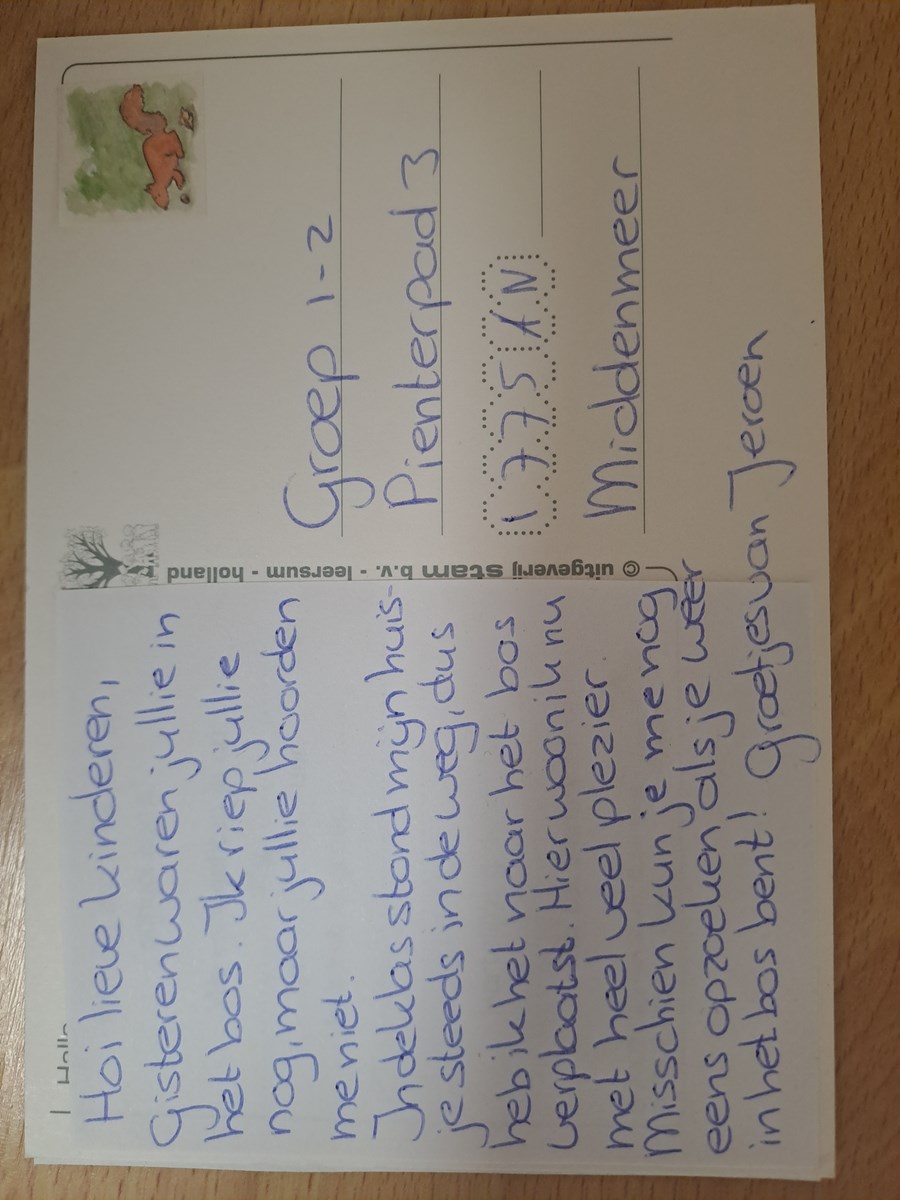 Vandaag kregen we post van Jeroen. We hadden zijn huis al gemist in de klas, maar wisten niet waar hij naar toe was gegaan. Jeroen woont nu in het bos. Hij heeft ons gisteren nog voorbij zien lopen. hij heeft ons nog geroepen, maar helaas hebben we hem niet gehoord. Misschien komen jullie hem wel tegen als je weer een keertje naar het bos gaat. Doen jullie hem dan de groetjes van ons?