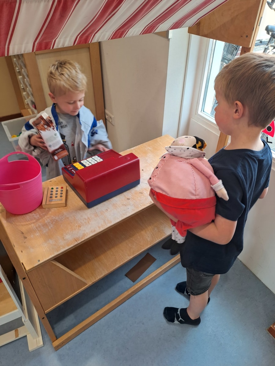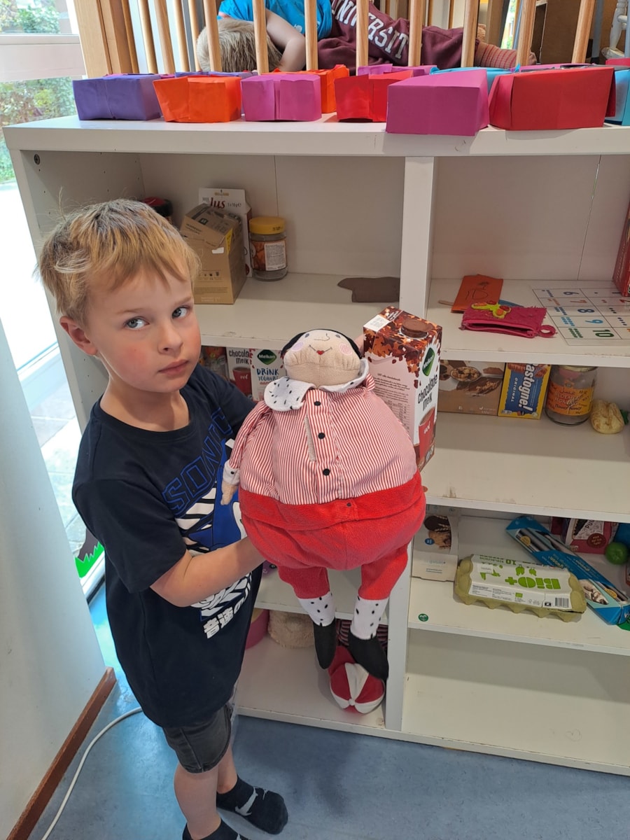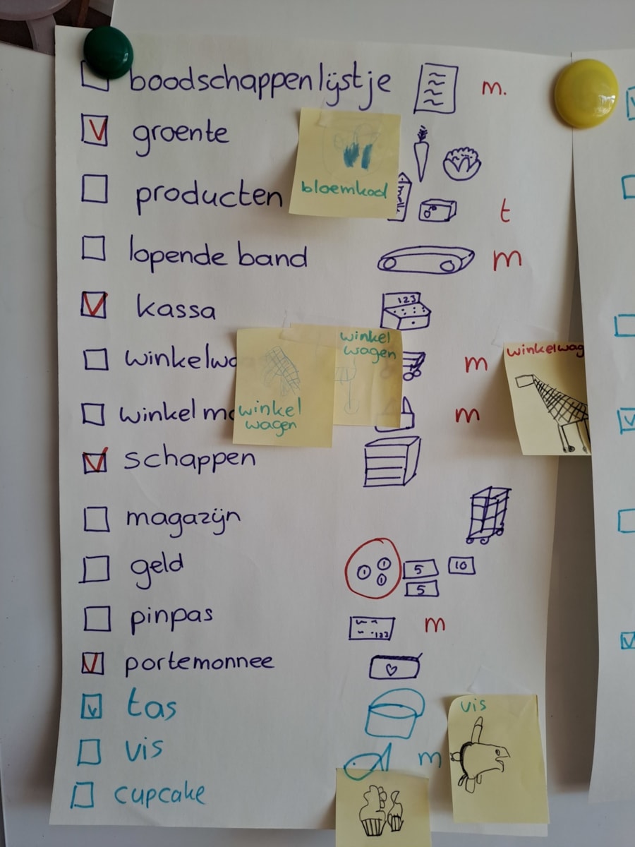 Och, wat jammer voor ons, maar ook erg zielig voor Joris. Wat konden we doen om hem te helpen? Er werden goede ideeën bedacht: een boodschappenlijstje voor hem maken, met hem mee gaan.. Goede tips, maar dan kan hij het nog steeds niet alleen. Toen bedachten we dat we ook een supermarkt in de klas kunnen maken, waarin Joris kan oefenen. Wat een goed idee!