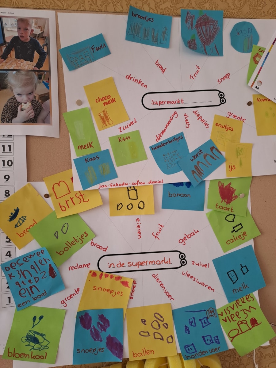 Om dat idee te laten slagen, zijn we eerst gaan kijken wat we al weten over de supermarkt. We zijn filmpjes gaan kijken over de supermarkt en we hebben er boeken over gelezen. Daarna zijn we gaan uitzoeken wat we nodig hebben om onze eigen supermarkt te maken. Sommige dingen, zoals de producten, kunnen we van thuis meenemen, andere dingen, zoals een lopende band, gaan we zelf proberen te maken. Ondertussen leren we ook heel veel over de supermarkt. Wist u dat een supermarkt verschillende afdelingen heeft? En dat melk bij de zuivel hoort en taart bij gebak. Joris vindt onze supermarkt ook nog best spannend, maar de kinderen steunen hem goed.